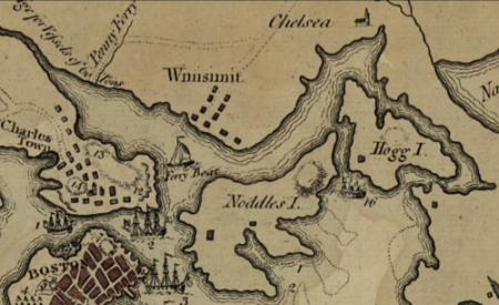 Here’s more media coverage tied to the 250th anniversary of the start of the American Revolution, via the Globe, which dispatched a photographer to yesterday’s reenactment of the little-known Battle of Chelsea Creek in East Boston. … Some readers in the comments section express disappointment that the Globe didn’t provide more details about the battle. But judging by the lack of a reporter’s byline, I assume it was always meant to be just a photo-gallery package. Which is fine with me. I’m just glad they covered the event. … For history buffs, here’s a detailed description of the battle, which was more extensive than I thought. It’s also known as the Battle of Noddle’s Island, among other names, and much of the fighting did occur on Noddles. See colonial-era map above. … Also for history buffs: See GBH’s piece last week on the little-known “courthouse rebellions” of 1774.