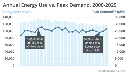 Setting aside the “effectively gut” silliness, the Globe story is actually quite good, explaining how MassSave has seen more than a little mission creep since the start of the decade — and seen skyrocketing costs as a result. … MassSave needs to get back to its energy-efficiency roots. Look at the ISO New England power-usage chart below. Notice how total energy consumption (light blue bars) has declined since 2006, the year MassSave started, and how peak usage has remained basically flat over the years (dark blue). Since the chart measures total New England power usage, MassSave can’t be credited for all the recent savings – but it certainly deserves some of the credit. Bottom line: conservation in Massachusetts and across the region has worked.